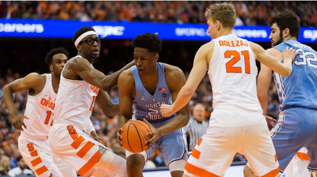 Off the cuff: If ESPN can't get their technical issues solved quicker than that, they should allow the ACC Network to also air ACC games separately to local audiences. Carolina shot well in the first half and probably should have been up by 12 at the half - were it not for a buzzer-beater three after a Kenny Williams block that unfortunately went out of bounds with two seconds left. The Tar Heels couldn't do much with a hot Tyus Battle in the second half, especially during a five or six minute period when he scored 11 points. A 10-point Carolina lead midway through the second half evaporated by the three-minute mark. But a W is a W and sometimes it's better to learn how to deal with adversity and win close games than to blow people out. Still, it would be nice for Carolina to put away teams when they can. Seniors Theo Pinson and Joel Berry are ending their Carolina careers on a high note - so far. Pinson scored a career-high 23 points against Syracuse and was an assist master in the first half. His best assist may have come in the second half however when he passed behind his head to Sterling Manley for a bucket that gave UNC a 58-50 lead. Berry scored the last four points when the game was on the line. His steal and coast-to-coast contest layup with 1:36 left was the play of the game. The Tar Heels had nine steals on the night on defense to go along with 25 assists on offense. |