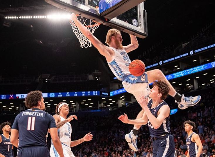 UNC's Brady Manek dunks on Virginia during impressive ACC tourney win. (UNC Sports Information photo by Maggie Hobson.)