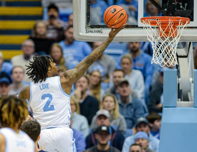 Love swished a three to give the Heels their first double-digit lead at 31-21 with just under six minutes in the half. Then he hit a three late in the first half to give Carolina a 41-28 margin at the half.
