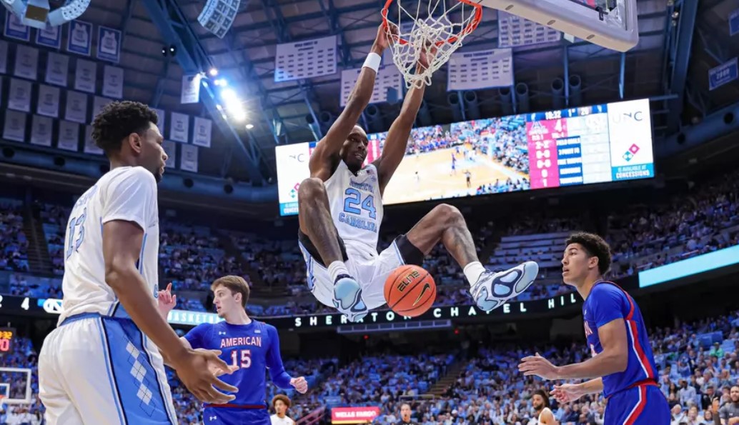 Off the cuff: The thing that likely stood out to Carolina fans during the game against American was three-point shooting. At first, American had it and Carolina didn't. The concern extended through the first half as American had five three pointers and Carolina had none. In fact, the Heels missed their first 10 threes. But in the second half, American went cold and Carolina heated up a bit. Both teams ended up with seven threes but the Heels actually took fewer shots to get there. The Eagles were seven of 31 while the Heels were seven of 22. Cade Tyson took the cover off the basket with a swish that elicited a huge cheer from the crowd. Seth Trimble followed less than a minute later with a three. Tyson hit all three of his threes over a five-minute period, during which time Carolina went from up by 15 to up by 35. After that, the Heels went on a 15-0 run over three minutes and 35 seconds. Everyone who was available to play got in the game. The last player to get in - walk on John Holbrook - scored inside to put the Heels over the century mark. And to clarify, that doesn't give fans free biscuits from Bojangles. It allows you the privilege of buying two sausage biscuits for a dollar. |