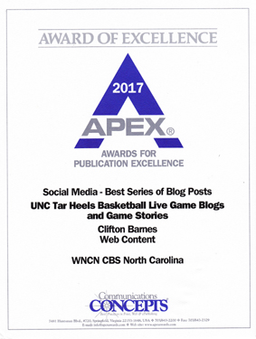 A series of UNC Tar Heels game blogs during the NCAA Tournament won an Award of Excellence from the DC area-based Communications Concepts through its 2017 Awards for Publication Excellence competition.